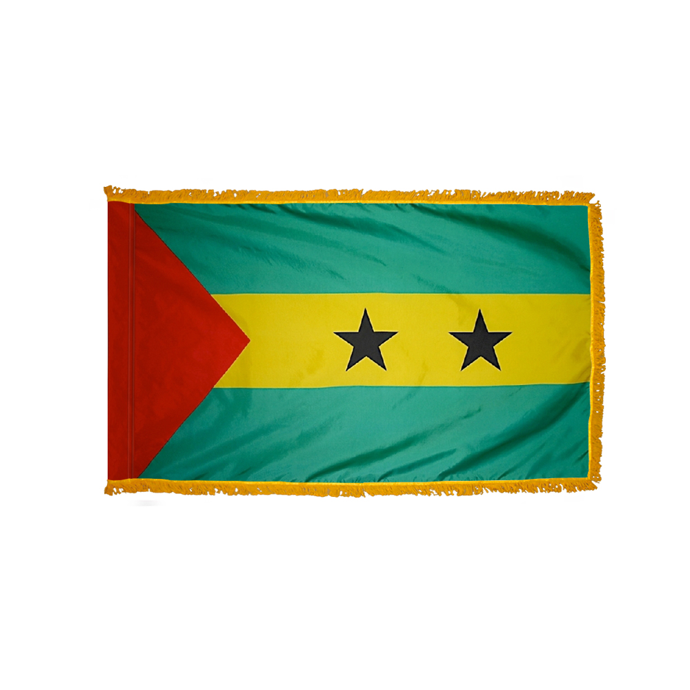 Sao Tome & Principe indoor flags are available in 3x5 ft. and 4x6 ft. nylon, and feature a pole sleeve with a flannel liner and a tab sewn inside the sleeve. The tab attaches to a hook or screw a top of the parade or display flagpole to keep the flag from sliding down the pole. Indoor and parade flags are finished with two-inch gold rayon fringe. These flags are also available with a pole sleeve only and no fringe (made to order, allow 2 weeks). All indoor flags are USA made. 3x5 ft. indoor flags are typically displayed on either 7 ft. or 8 ft. poles. 4x6 ft. indoor flags are typically displayed on 9 ft. poles.